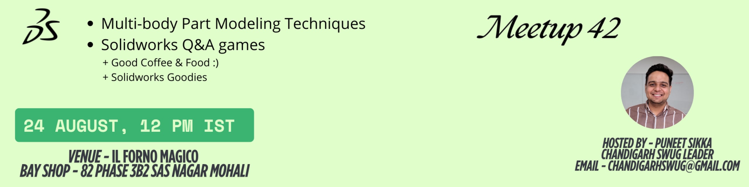 Join us on 24 AUGUST at 12 pm IST for an unforgettable afternoon hosted by Puneet Sikka, the leader of the Chandigarh SOLIDWORKS User Group. The event will take place at IL Forno Magico, Bay shop - 82, Phase 3b2, SAS Nagar, Mohali. Dive into the fascinating world of Multi-body Part Modeling Techniques and challenge yourself in our fun Solidworks Q&A games. Indulge in good coffee and delicious food, and don't miss the chance to grab some exclusive Solidworks goodies. This is Meetup 42 - a unique opportunity to learn, network, and elevate your SOLIDWORKS skills. Confirm your participation by contacting us at chandigarhswug@gmail.com. We look forward to seeing you there!